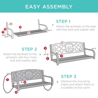 Grab a book or a friend and unwind on this elegant bench swing. Choose between a black or bronze color to perfectly complement your porch or yard. A set of 77-inch chains connect to 21-inch armrests. A 19-inch backrest paired with a 52-inch seat will accommodate you and your two favorite guests. These features come together in an easy assembly: step 1, attach the armrests to the seat with four bolt and washer sets. Step 2, attach the backrest to the armrests with two more bolt and washer sets. Finally, step 3 interlock the mounting chains and fasten them to a suitable anchor point. This bend features an elegant design. An open backrest with a fleur-de-lis motif and curved armrests promote balance & airflow in style. Enjoy your bench for years to come with a heavy-duty design that resists rust build-up and holds up to more than 485 lbs!