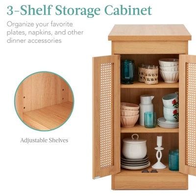 - 3-SHELF STORAGE CABINET: Adjustable shelves help you store your favorite dinnerware, napkins, and cutlery while two woven rattan cabinet doors provide extra protection