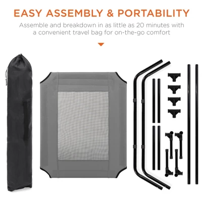 Give your pets the best while saving on space. A simple, complementary design fits in any room or outdoor setting while a raised, 4-leg design lifts your pet 8 inches off the ground to circulate & cool the air beneath them. Breathable nylon mesh disperses heat while the removable canopy blocks sunlight, giving your pet a cool resting surface. All of these cooling features slow the growth of pet odors and stains. Best of all, your pets will never be without a resting place; assemble and breakdown in as little as 20 minutes with a convenient travel bag for on-the-go comfort.