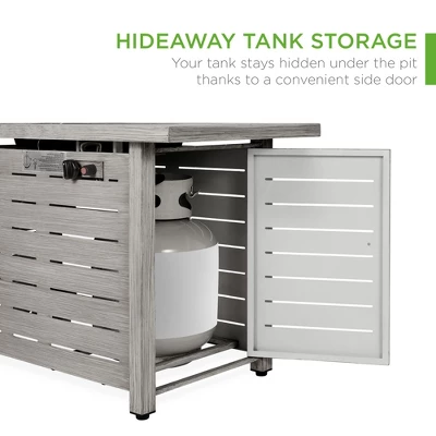 Turn up the heat and enjoy top-quality entertainment in your own backyard! This propane-powered Fire Pit table matches a pleasing profile with maximum utility. Your tank stays hidden under the pit thanks to a convenient side door. A weather-treated steel frame resists wear from wind and rain. Decorative glass beads add subtle style, while a burner lid increases table space for entertaining. A durable nylon cover ensures this fire pit table will withstand the elements. Whether you’re throwing a pool party or hosting dinner al fresco, this fire pit is the perfect centerpiece to entertain guests with outdoor dining and conversation!