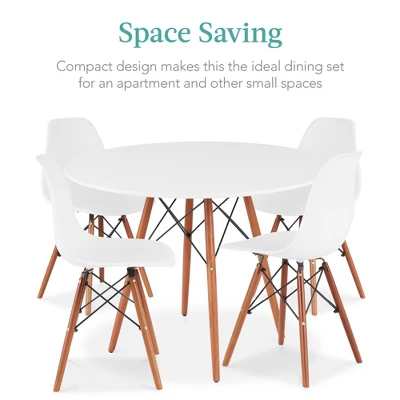 Add a stylish necessity to your living space with our 5-Piece Mid-Century Modern Dining Set. Crafted with beech wood legs and an easy-to-clean tabletop, this set is the perfect complement to a modern home setup. Whether for family dinners or even a double date, this set provide an inviting aesthetic that will make you and your guests want to lounge for hours. Thanks to its compact design, little space is taken up when not in use. Versatility in your dining furniture starts here! Ships and arrives in 2 separate boxes. Delivery times may vary per box.