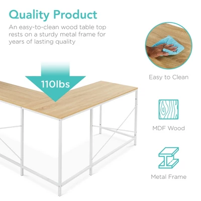 Invest in an L-shaped workstation built for less clutter and more convenience thought your day. It includes a versatile, multifunctional bookshelf to maximize space saving at your desk; storing items on the shelves adds more room in your work area. Standing 58 inches tall with spacious shelving, this 5-tier bookcase stores up to 85 lbs. of books, office supplies, and more! This includes 5 sturdy shelves that each hold up to 17 lbs. and contain 12 of space between shelves. Its customizable setup lets you arrange your modular desk to be used by itself, or attach the bookshelf to either end’s inside or outside edge for easy storage (see images for left assembly and right assembly). Plus, an easy-to-clean wood table top rests on a sturdy metal frame for a quality product that lasts for years to come. You’ll enjoy a stable design, as flat feet and a crossed X in the frame provide ample stability.”