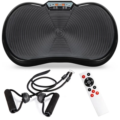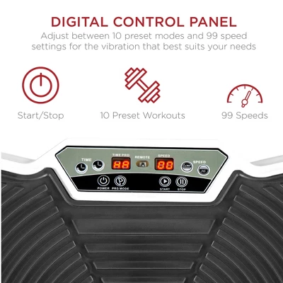 Feel the soothing sensation of a gentle massage with this vibration plate exercise machine – low-impact oscillation and high-intensity vibration pair for gentle stimulation of your joints and muscles. A digital control panel allows you to adjust between 10 preset modes and 99 speed settings for the vibration that best suits your needs. Or conveniently control power, time, and speed settings with the included remote instead of reaching for the platform. Use the included resistance bands for various additional challenges to your workout and target specific muscle areas for an effective workout. A built-in handle helps make transporting this machine a breeze, while suction pads keep it in place and reduce impact on your floors.